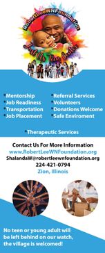 While half a million American children are in foster care. Over 40% of foster children will be homeless, incarcerated, or die within the first three years of leaving the foster care system. Robert Lee WN Foundation, Just Us will provide food, clothes, toiletries as well as referral services for temporary and permanent shelter including emergency, transitional and low-income housing, along with other pertinent needs. Please inquire within for immediate services.